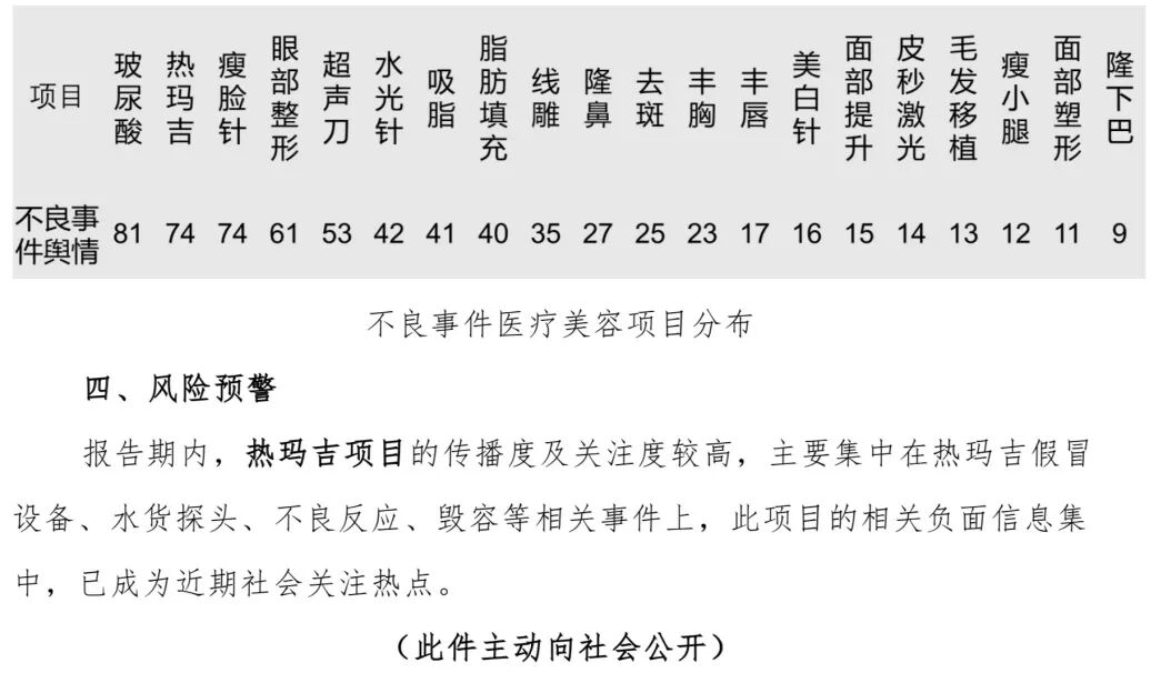 「报告期内,不良相关事件的医疗服务或产品,有热玛吉等等。」舆情报告指出,其中热玛吉居于首位,提醒美容就医者重点关注项目风险。