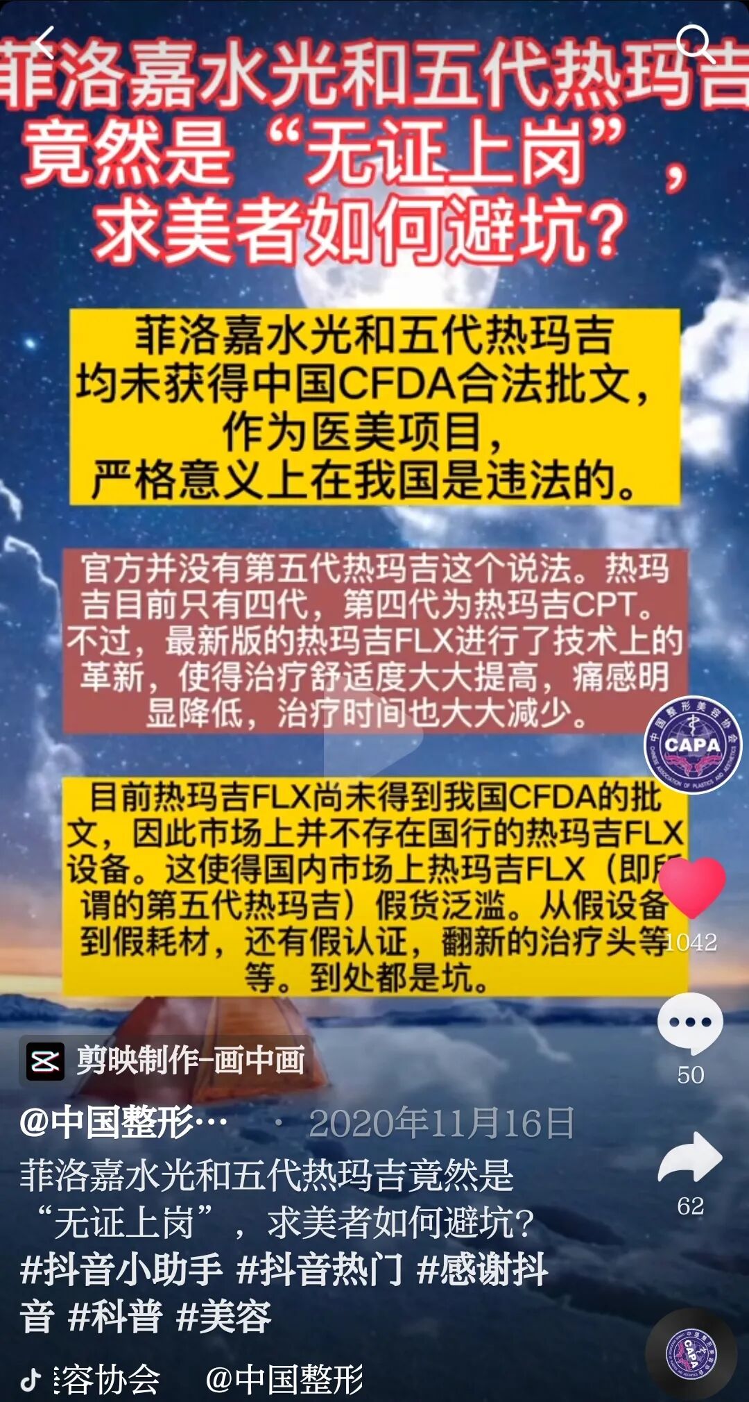 2020 年 11 月 16 日,中国整形美容协会在其官方抖音号发布视频称,市场上并不存在国行的第五代热玛吉设备。