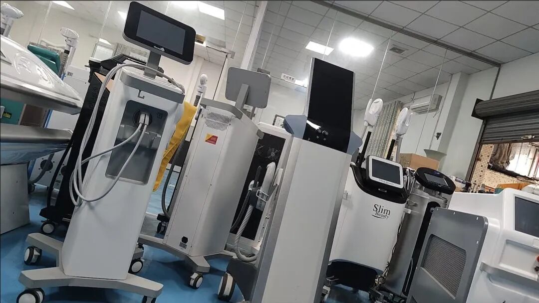 进入厂房后「偶尔治愈」看到,厂里摆放着许多已经组装好的医疗美容设备,包括热玛吉、欧洲之星 Fotona 4D、激光脱毛仪等,十几名工人正忙着搬运货物、测试仪器。厂内有一个大型的仓库,堆叠着大量已经装箱的医美设备。